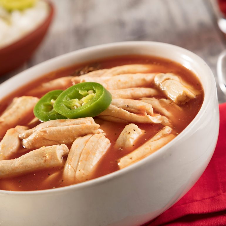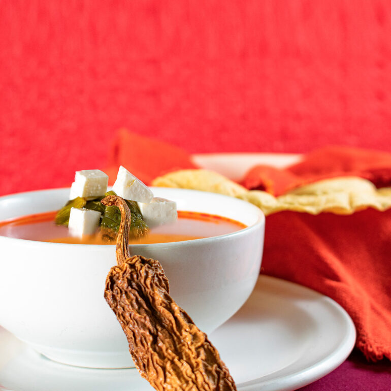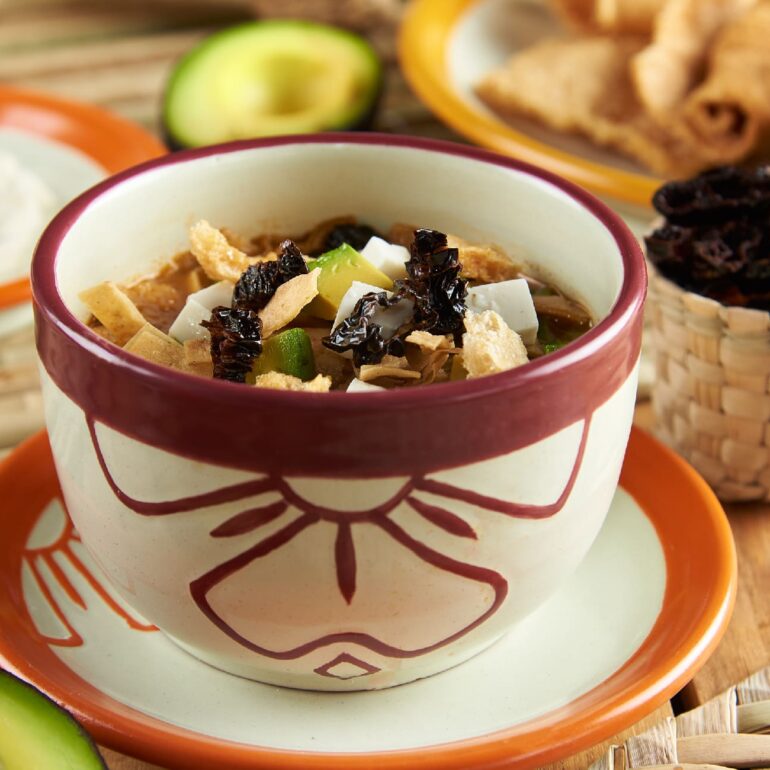 Sopa tradicional mexicana elaborada con caldo de jitomates molidos, ajo y cebolla, sazonado con epazote, se sirve con tiras fritas de tortilla de maíz y chile pasilla, chicharrón de cerdo, aguacate, queso asadero o fresco y crema.
