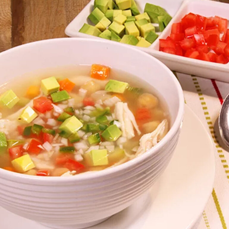 Consomé de pollo con arroz, pollo, aguacate, jitomate, cebolla y chile picado.