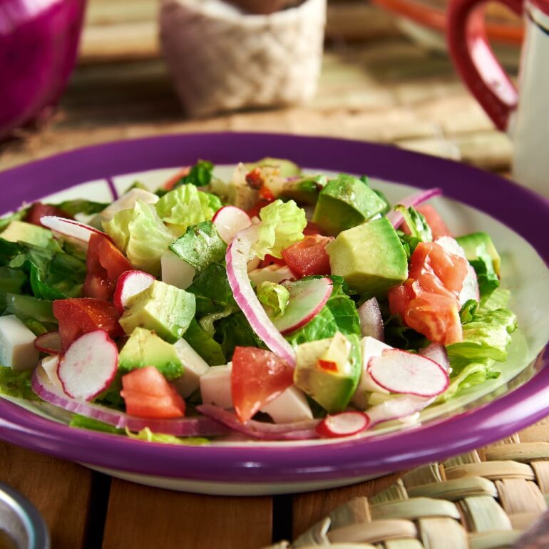 Lechuga, jitomate, cebolla morada, jamón, aguacate y queso panela, acompañada con vinagreta.